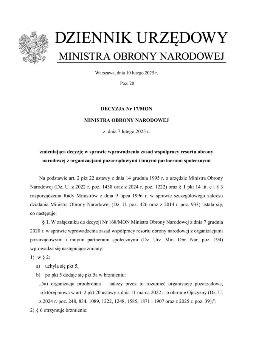 Przedstawiamy do wykorzystania i rozpowszechnienia w podległych kołach Decyzję Nr 17/MON Ministra Obrony Narodowej z dnia 7 lutego 2025 r. zmieniającą decyzję nr 168/MON z dnia 7 grudnia 2020 r. w sprawie wprowadzenia zasad współpracy resortu obrony narodowej z organizacjami pozarządowymi i innymi partnerami społecznymi.