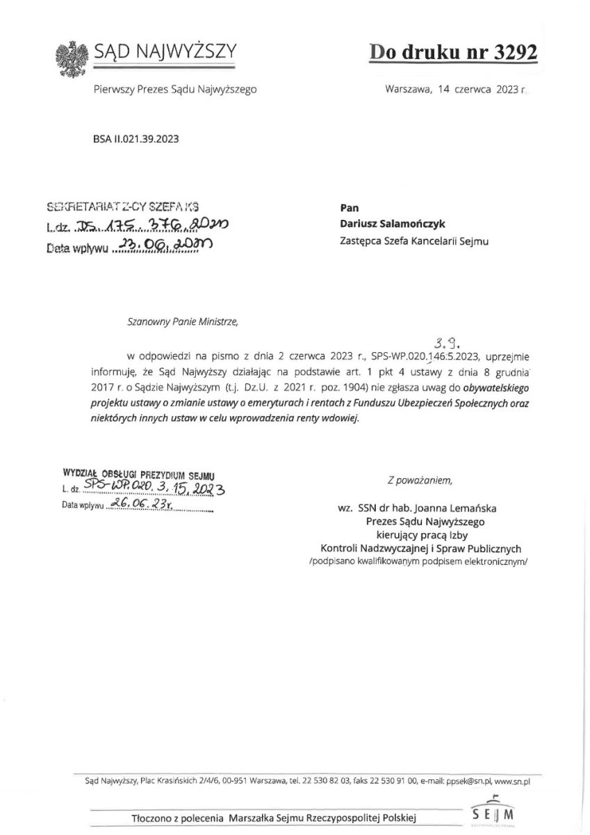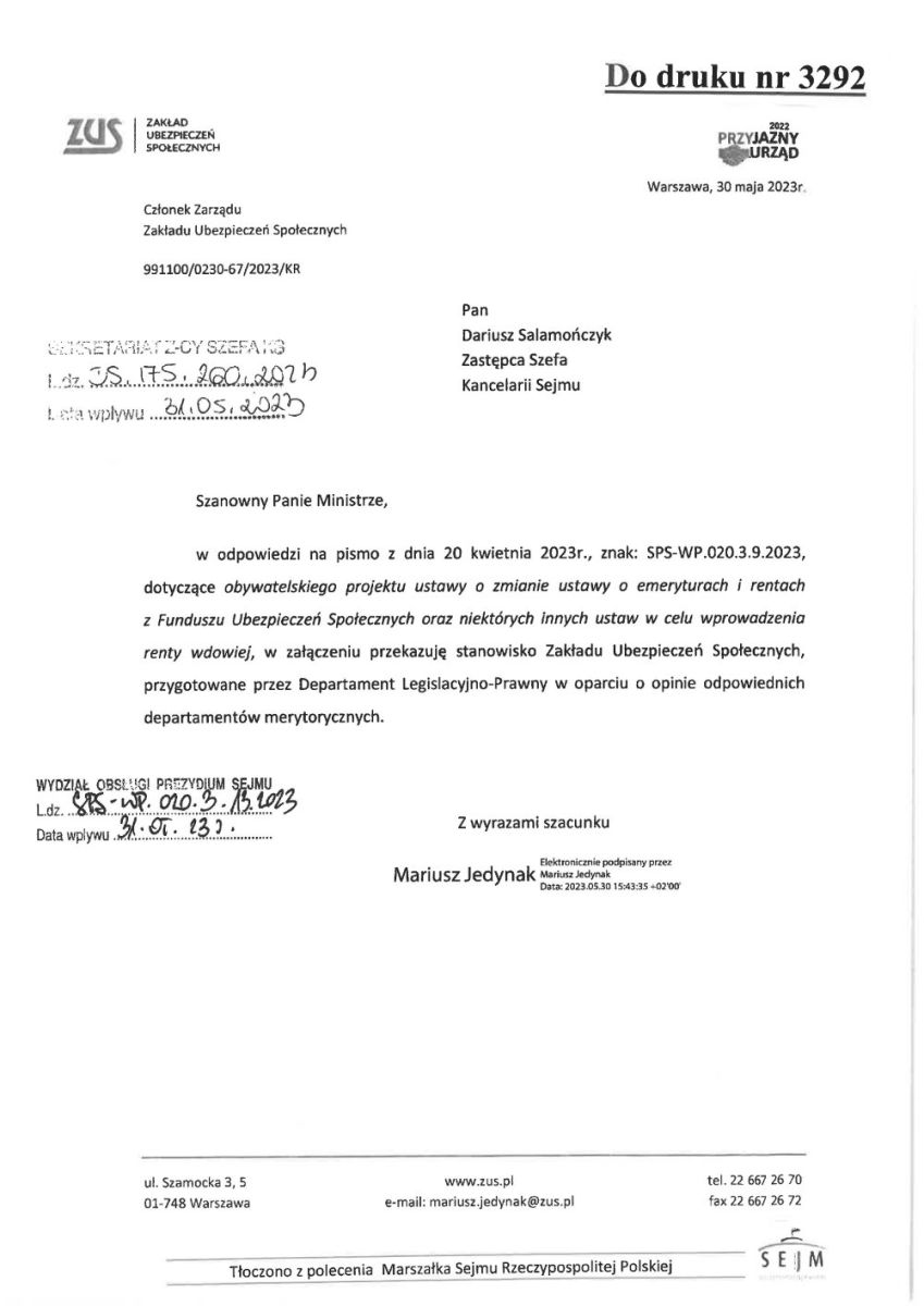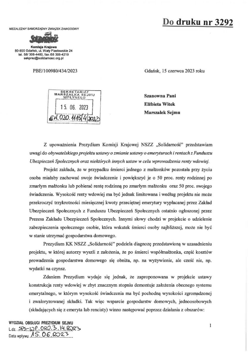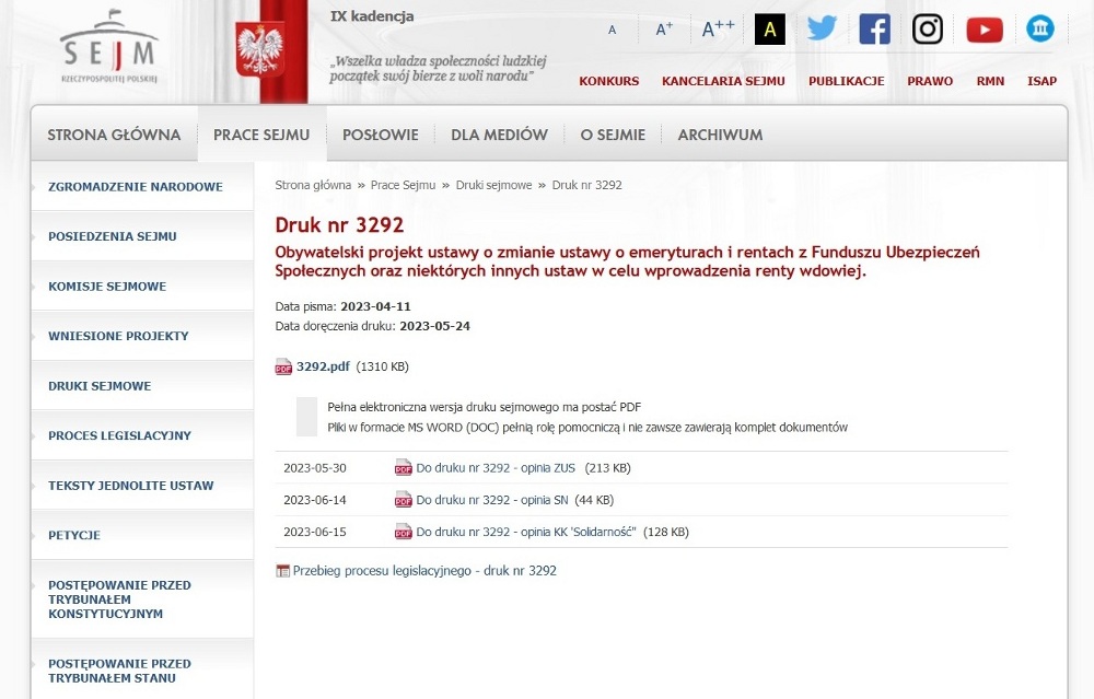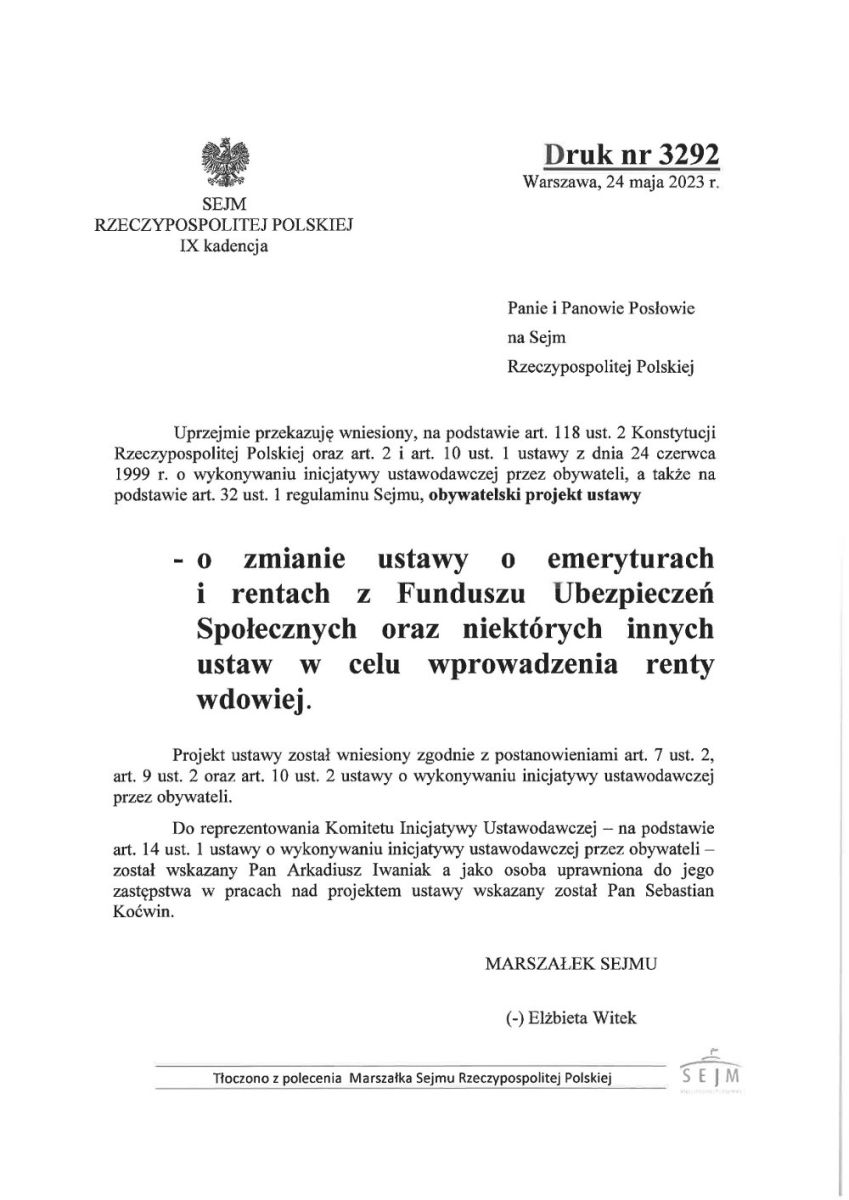 W Sejmie trwają prace legislacyjne dotyczące obywatelskiego projektu ustawy o zmianie ustawy o emeryturach i rentach z Funduszu Ubezpieczeń Społecznych oraz niektórych innych ustaw w celu wprowadzenia renty wdowiej - druk nr 3292.