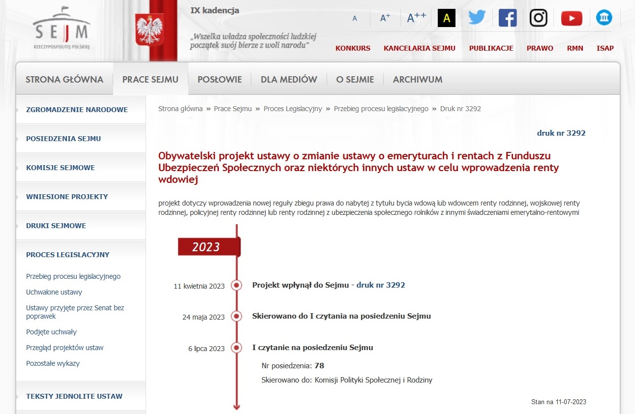 W dniu 6 lipca 2023 r. na 78. posiedzeniu Sejmu RP od godz. 17.42 odbyło się pierwsze czytanie obywatelskiego projektu ustawy o zmianie ustawy o emeryturach i rentach z Funduszu Ubezpieczeń Społecznych oraz niektórych innych ustaw w celu wprowadzenia renty wdowiej (druk nr 3292).