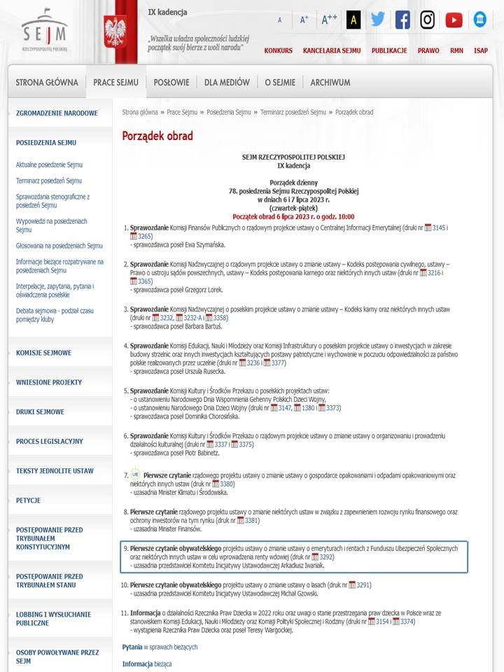 Na zakończenie tej części 78. posiedzenia wicemarszałek Sejmu IX kadencji Włodzimierz Czarzasty poinformował, że Marszałek Sejmu RP po zasięgnięciu opinii Prezydium Sejmu IX kadencji proponuje skierować projekt ustawy o zmianie ustawy o emeryturach i rentach z Funduszu Ubezpieczeń Społecznych oraz niektórych innych ustaw w celu wprowadzenia renty wdowiej (druk nr 3292) do Komisji Polityki Społecznej i Rodziny w celu rozpatrzenia. Nie zgłoszono żadnego sprzeciwu i tym samym dalsze prace legislacyjne będą odbywały się w wyżej wymienionej Komisji.