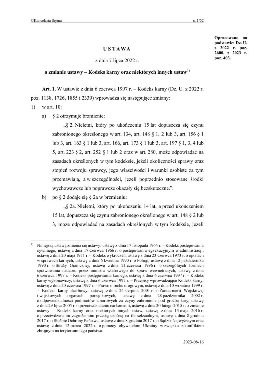 Ogłoszona 13 grudnia 2022 r. Ustawa z dnia 7 lipca 2022 r. o zmianie ustawy - Kodeks karny oraz niektórych innych ustaw (Dz. U. 2022 poz. 2600) stanowi niezwykle obszerną i w wielu aspektach fundamentalną reformę polskiego kodeksu karnego.