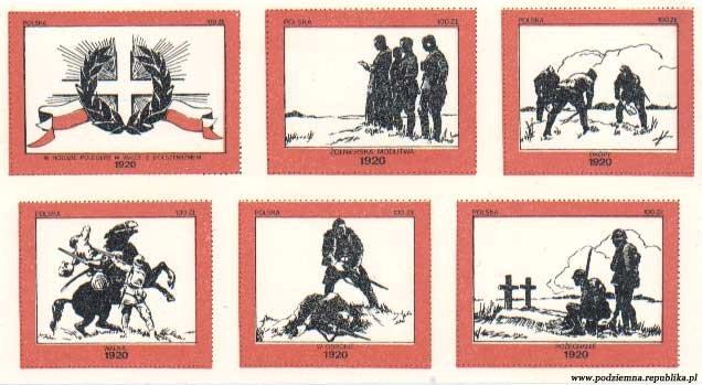 Jednym z walorów filatelistycznych „drugiego obiegu” był blok wydany w 1985 r. w hołdzie poległym w walce z Bolszewikami w 1920 roku. Poszczególne znaczki w kolejności od górnego rzędu z lewej strony zatytułowano: „W hołdzie poległym w walce z bolszewikami, Żołnierska modlitwa, Okopy, Walka, W obronie i Pożegnanie”. Znaczki wydrukowano całościowo w bloku o formacie 16 x 9 mm, brak jest jednak danych o samym autorze znaczków.
