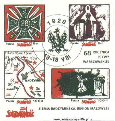 W trzy lata później Podziemna Poczta Solidarność Ziemi Radzymińskiej, Regionu Mazowsze wydała blok (9,5 x 10,5 mm) upamiętniający 68. rocznicę polskiego zwycięstwa w wojnie z bolszewikami.