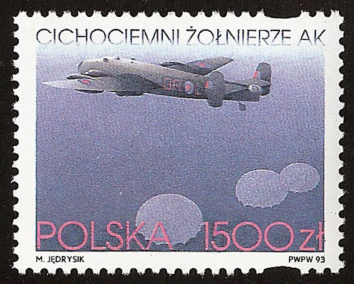 Inny znaczek wydany trzy lata później poświęcony jest, co prawda pamięci żołnierzy AK „cichociemnym” to jednak widnieje na nim brytyjski czterosilnikowy ciężki samolot bombowy „Halifax”. Już we wrześniu 1941 r. jedna z polskich załóg została włączona w skład brytyjskiego 138 dywizjonu specjalnego przeznaczenia „Special Duty Squadron”, wykonującego loty na „Halifaxach” z zaopatrzeniem dla Armii Krajowej. W kwietniu 1943 r., po rozwiązaniu dywizjonu bombowego 301 na skutek dużych strat, część jego załóg przydzielono do wymienionego 138 dywizjonu, jako jego eskadrę. W kilka miesięcy później przemianowano ją na 301. polską eskadrę specjalnego przeznaczenia „301 Polish Special Duty Flight”. Na tych maszynach polscy piloci przerzucali też do okupowanego kraju „cichociemnych” przeszkolonych w zakresie dywersji.