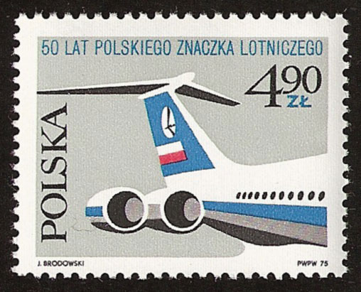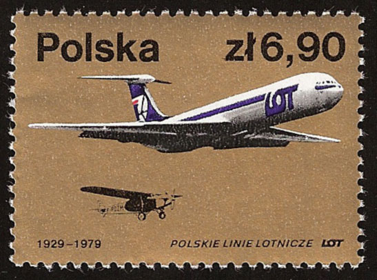 Samolot „Ił-62” widnieje również na znaczku wprowadzonym do obiegu w 1979 roku z okazji 50-lecia Polskich Linii Lotniczych „LOT”. Poniżej widoczna jest także sylwetka jednosilnikowego samolotu z lat 20. „Fokker” produkcji niemieckiej. Konstruktorem pierwszego „Fokkera” w 1912 r. był jednak Holender. Dopiero podczas I wojny światowej projektant maszyny połączył swoje siły z niemieckim producentem Hugo Junkersem. Z tego okresu pochodzi „Fokker” wyposażony w zsynchronizowane karabiny maszynowe strzelające przez śmigło bez jego uszkodzenia. Po wojnie Anton Fokker wziął „rozwód” z Hugo Junkersem i powrócił do Holandii, gdzie z powodzeniem ukierunkował się na produkcję samolotów pasażerskich. Właśnie „Fokkery” obok „Junkersów F-13” były pierwszymi samolotami w Polskich Liniach Lotniczych „LOT”, które powstały 1 stycznia 1929 roku, z połączenia wszystkich działających w kraju linii lotniczych. Natomiast pierwsze międzynarodowe loty (do Bukaresztu) uruchomiono już w roku następnym z lotniska mokotowskiego.
