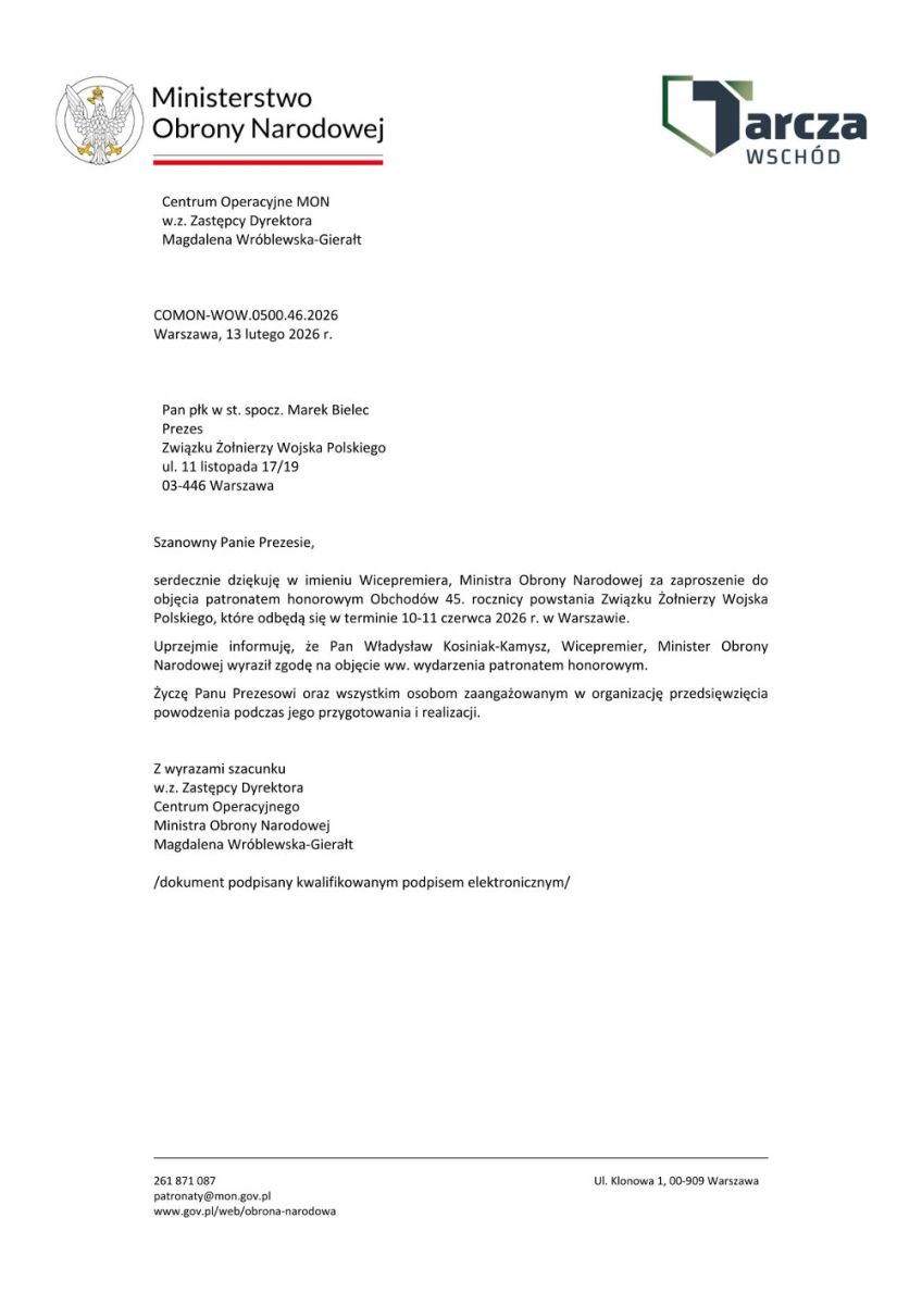 Pan Władysław Kosiniak-Kamysz, Wicepremier - Minister Obrony Narodowej wyraził zgodę na objęcie patronatem honorowym obchodów 45. rocznicy powstania Związku Żołnierzy Wojska Polskiego, które odbędą się w dniach 10 ÷ 11 czerwca 2026 r. w Warszawie.