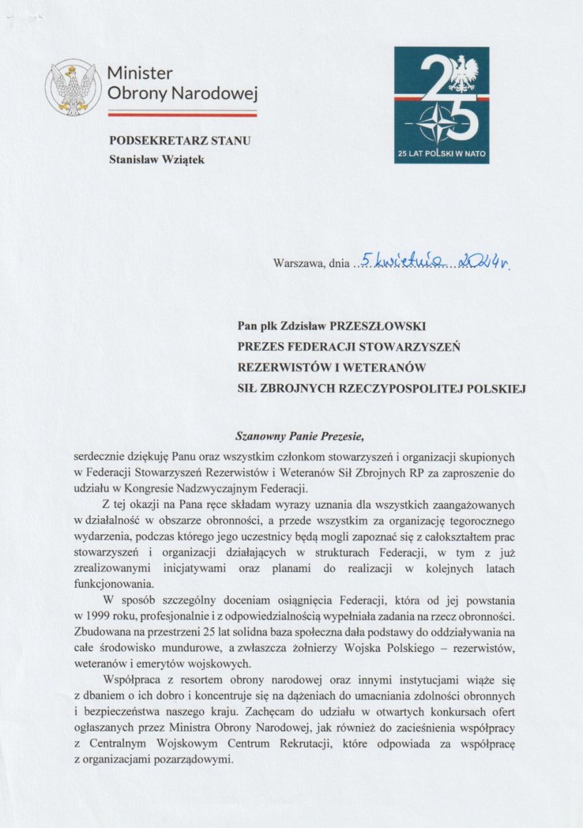 W ramach dyskusji ppłk Jerzy Porajski odczytał list Podsekretarza Stanu w MON Pana Stanisława Wziątka skierowany do członków Federacji sygnalizujący zdecydowane poparcie naszego środowiska przez Kierownictwo Resortu Obrony Narodowej.
