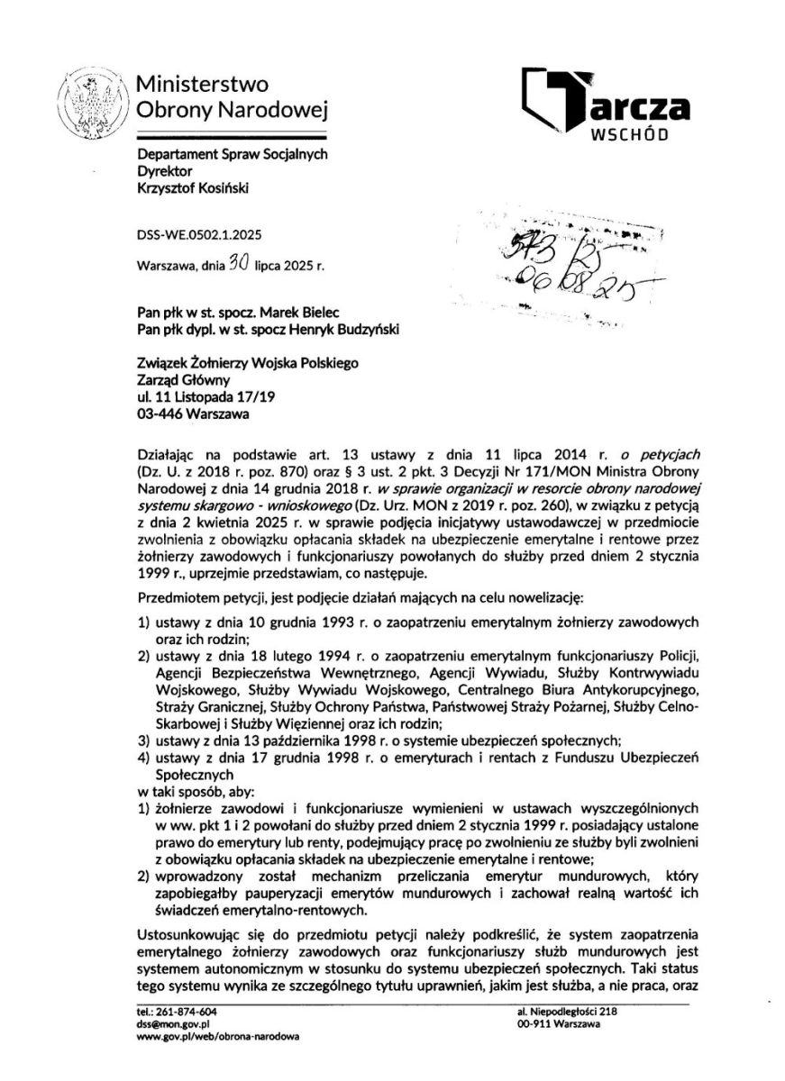 W dniu 8 sierpnia 2025 r. na adres Biura Związku Żołnierzy Wojska Polskiego wpłynęła odpowiedź Dyrektora Departamentu Spraw Socjalnych MON Pana Krzysztofa Kosińskiego na petycję skierowaną w dniu 2 kwietnia 2025 r. do Premiera Donalda Tuska.