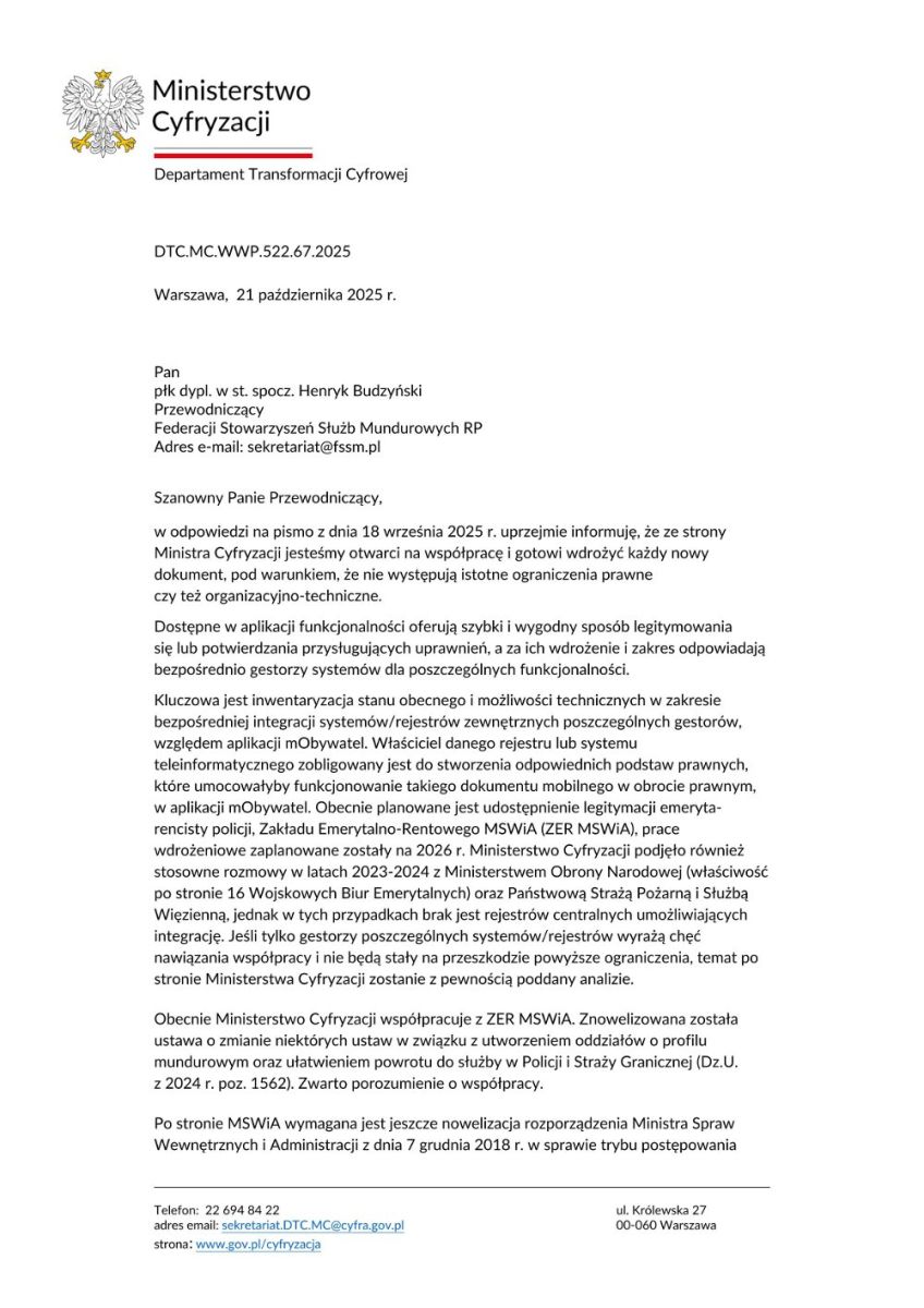 Na adres Federacji w dniu 24 października 2025 r. wpłynęła odpowiedź, z której wynika, że „resorty siłowe” i podlegające im organy emerytalno-rentowe, mające w swych strukturach wysoce wyspecjalizowane służby informatyczne, do tej pory nie poradziły sobie z tym problemem i nie wiadomo kiedy sobie poradzą.