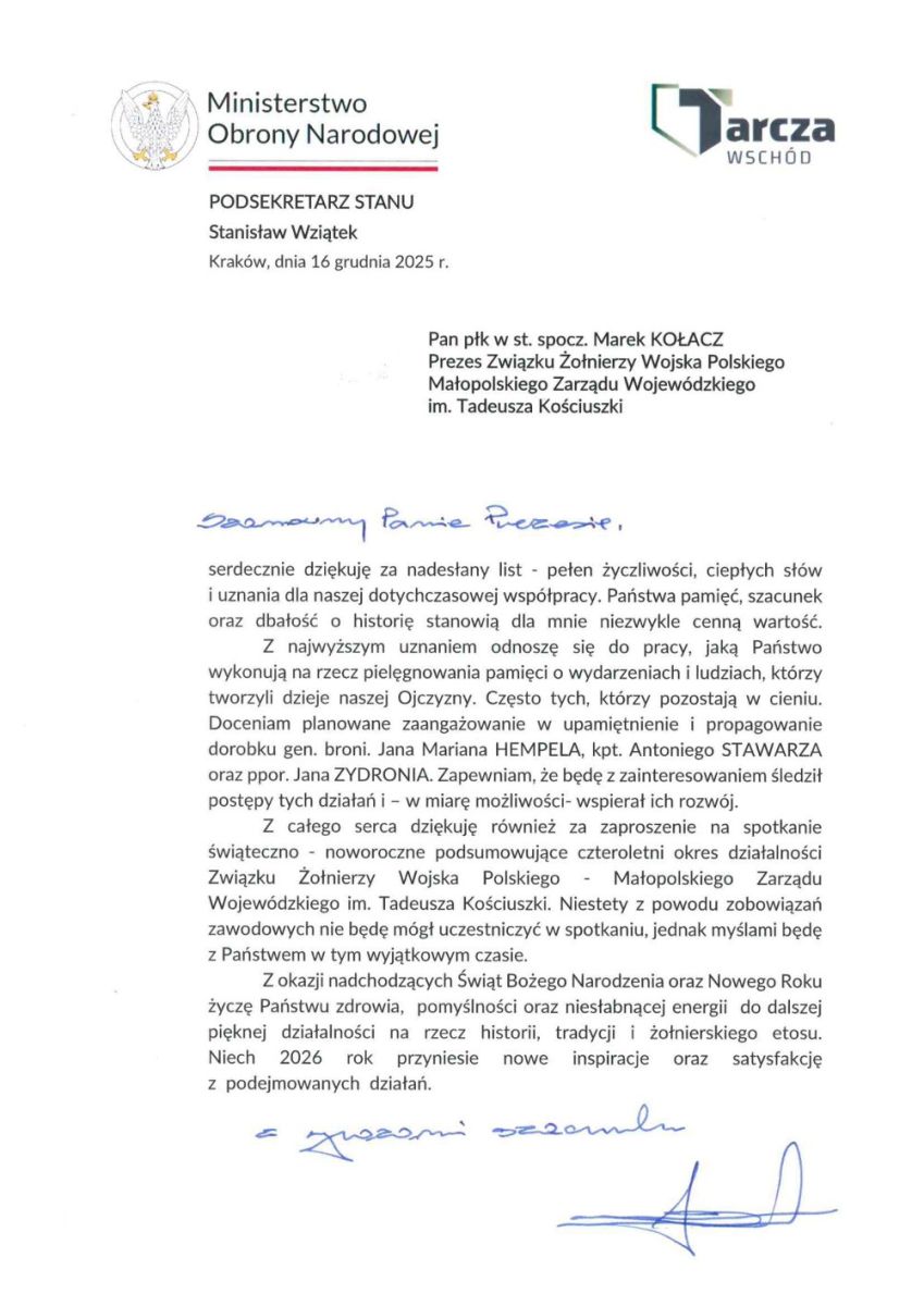 Listy do uczestników spotkania skierowali: Wicepremier, Minister Obrony Narodowej pan Władysław Kosiniak Kamysz z życzeniami świąteczno noworocznymi i Wiceminister ON pan Stanisław Wziątek z podziękowaniami za dotychczasowa współprace i życzeniami dalszego rozwijania działalności patriotyczno wojskowej.