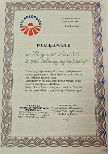 25 czerwca 2025 r. Zarząd Koła nr 5 ZŻWP w Ustce odwiedziła Pani Prezes Usteckiego UTW - „Żyj kolorowo” Władysława Graniak przynosząc piękny album przedstawiający 20 lat działalności Uniwersytetu oraz dyplom z podziękowaniem za długoletnią współpracę.